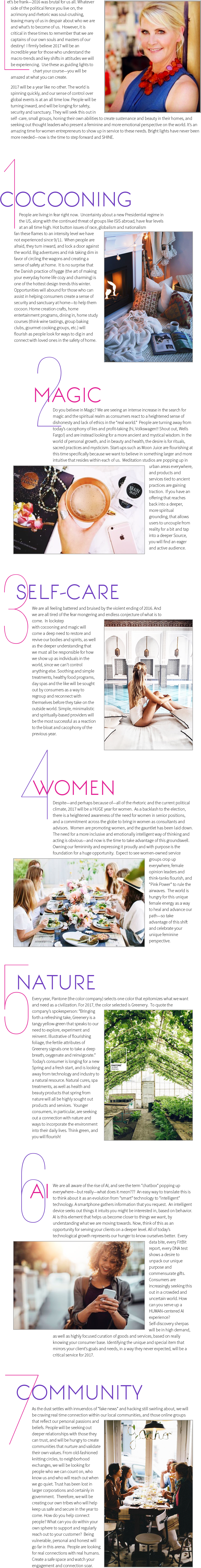 We are all feeling battered and bruised by the violent ending of 2016. And we are all tired of the fear mongering and endless conjecture of what is to come. In lockstep with cocooning and magic will come a deep need to restore and revive our bodies and spirits, as well as the deeper understanding that we must all be responsible for how we show up as individuals in the world, since we can’t control anything else. Soothing and simple treatments, healthy food programs, day spas and the like will be sought out by consumers as a way to regroup and reconnect with themselves before they take on the outside world. Simple, minimalistic and spiritually-based providers will be the most successful as a reaction to the bloat and cacophony of the previous year.