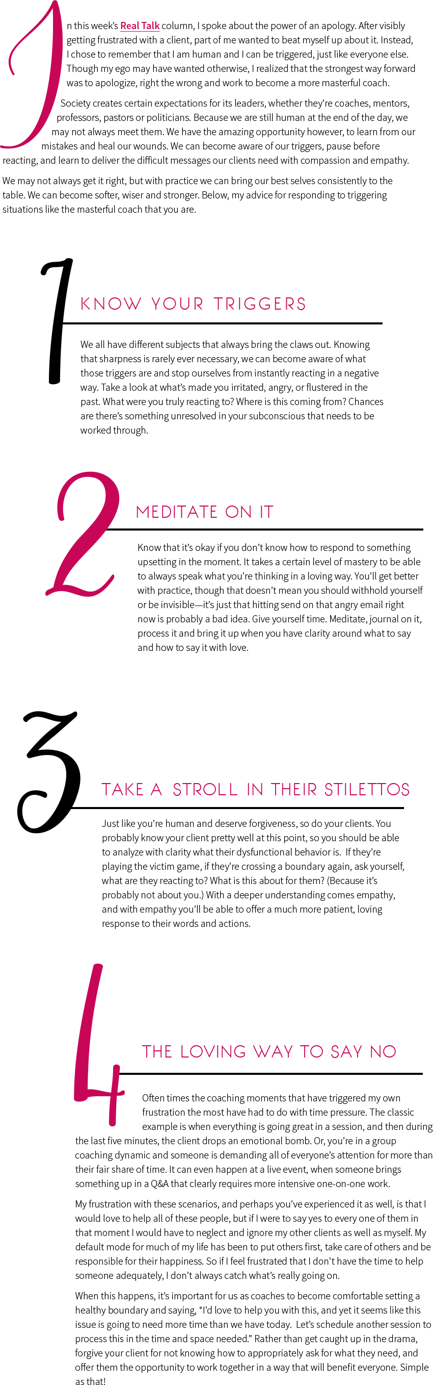 In this week’s Real Talk column, I spoke about the power of an apology. After visibly getting frustrated with a client, part of me wanted to beat myself up about it. Instead, I chose to remember that I am human and I can be triggered, just like everyone else. Though my ego may have wanted otherwise, I realized that the strongest way forward was to apologize, right the wrong and work to become a more masterful coach.